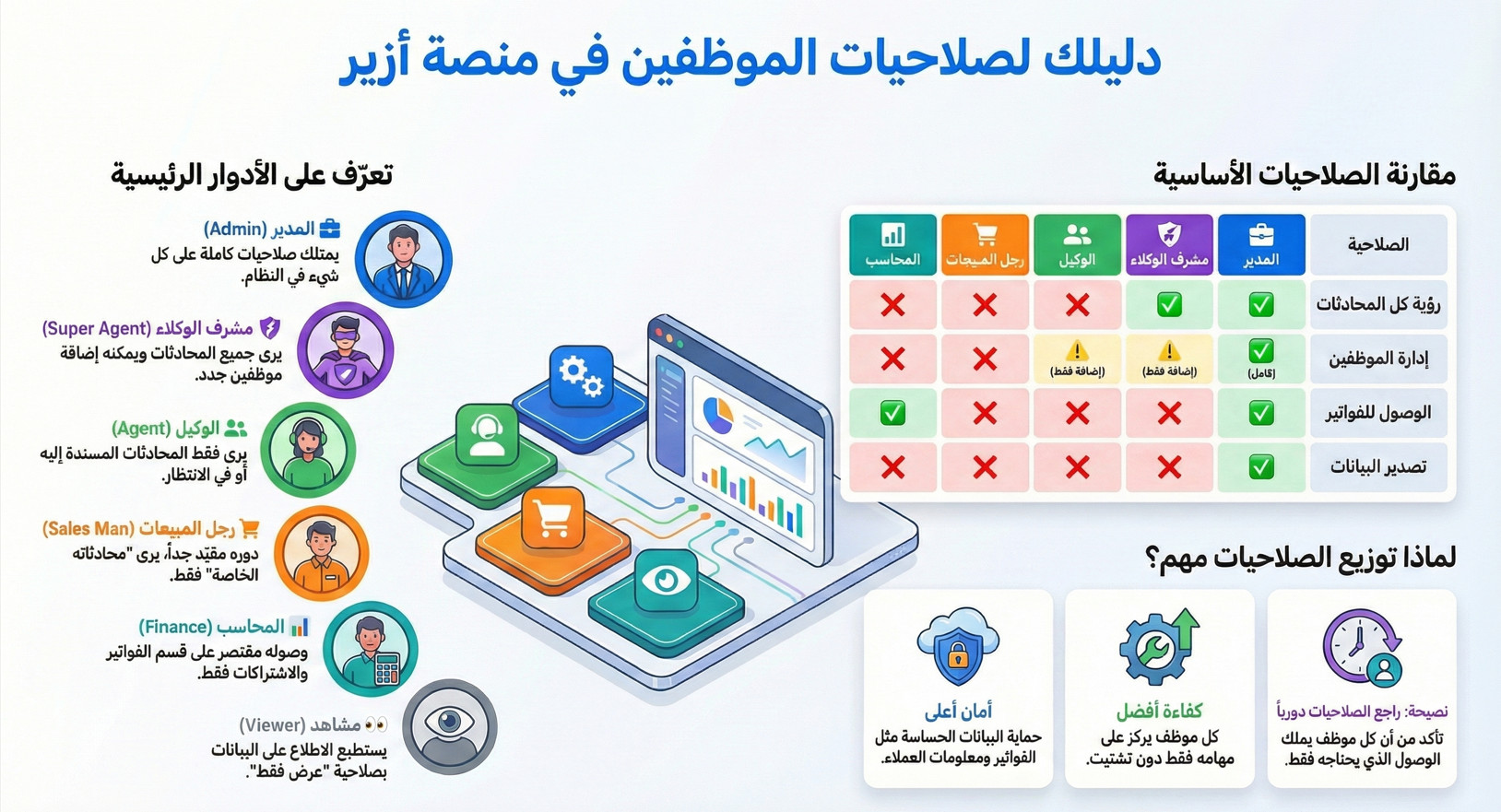 لتسهيل المقارنة واتخاذ القرار، يوضح الجدول التالي الصلاحيات التقنية لكل دور: