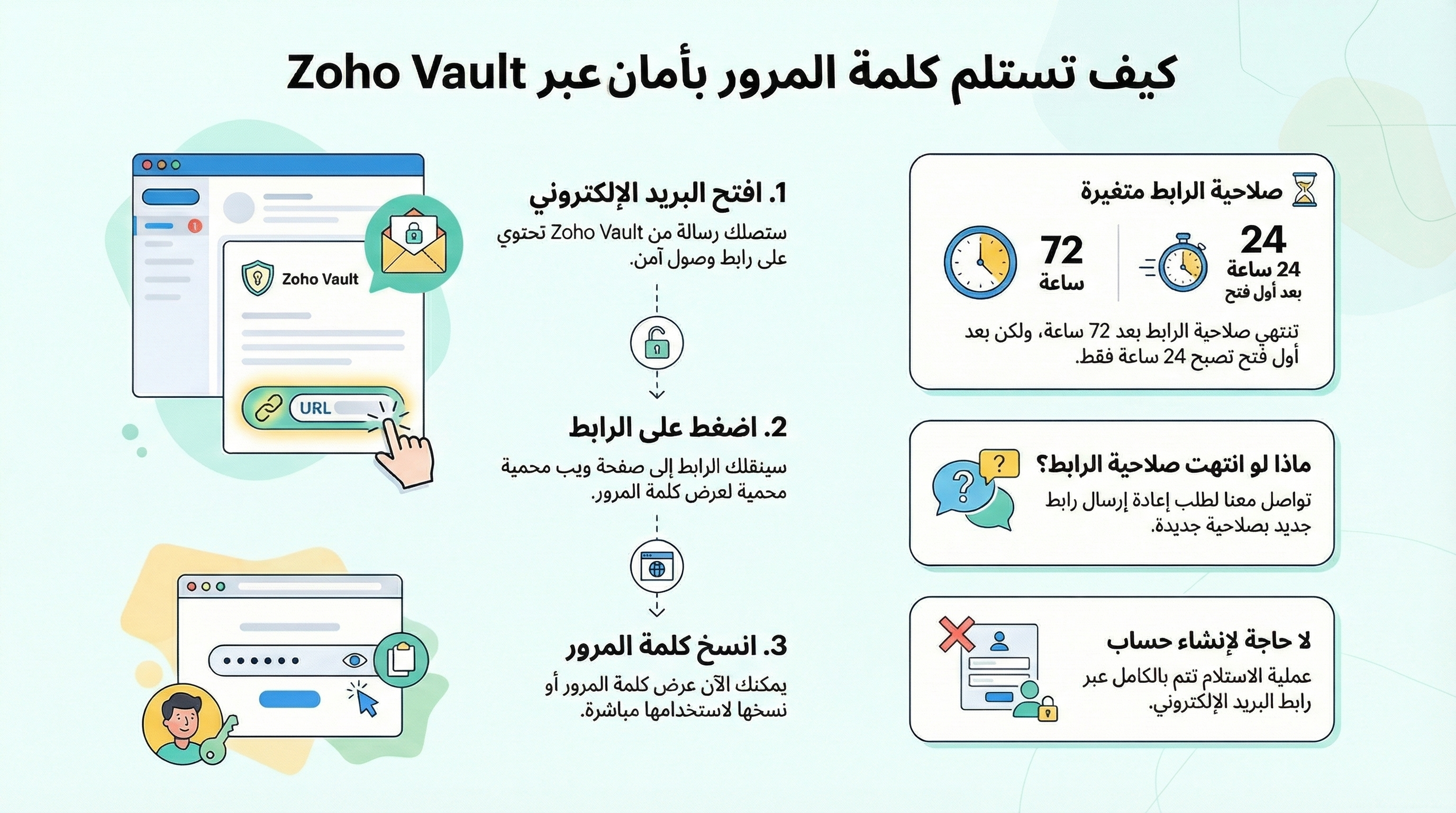 ستستلم كلمة المرور عبر رابط آمن من Zoho Vault دون الحاجة لإنشاء حساب. كل ما عليك هو فتح الرسالة والضغط على رابط الوصول.