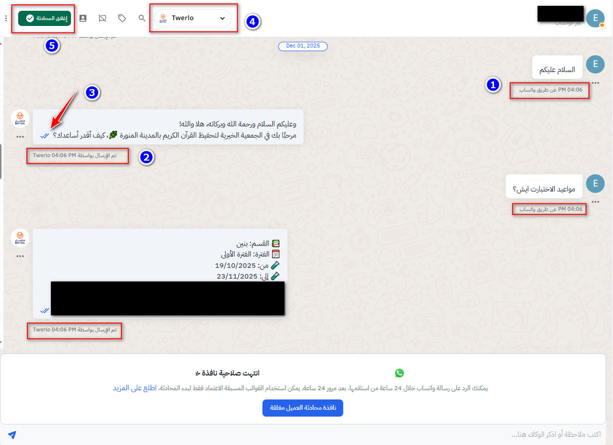 - إجراءات الإغلاق وإعادة الفتح: من قام بإغلاق المحادثة أو إعادة فتحها ومتى.
